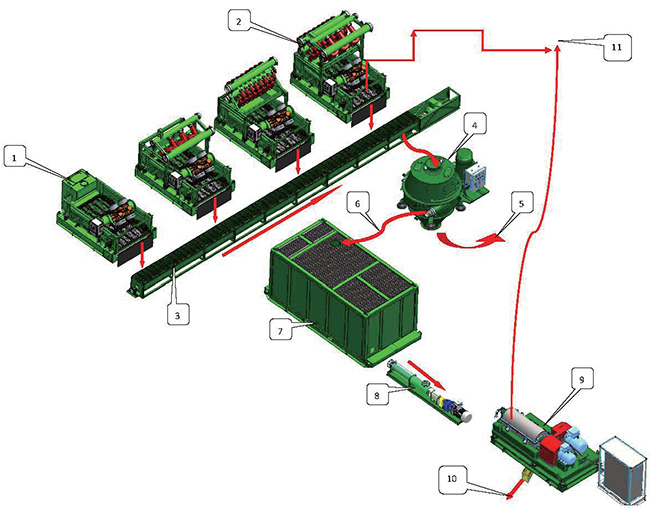 鉆井泥漿不落地處理工作流程說明如下:鉆機(jī)過來的泥漿通過高架管匯進(jìn)入振動(dòng)篩(1)、清潔器(2),經(jīng)過(1)、(2) 處理排放的鉆屑通過螺旋輸送器(3)輸送至立式甩干機(jī)處理(4)。立式甩干機(jī)處理完的固體通過廢渣(5) 排除,回收到的鉆井泥漿(6)進(jìn)入鉆井液泥漿罐體(7),離心機(jī)供液泵或螺桿泵(8)抽取含有細(xì)固 顆粒的回收泥漿,供給離心機(jī)(9 )處理,固體部分通過固體排渣口(10)排除,處理完成的鉆井液通 過干凈泥漿回歸泥漿系統(tǒng)(11)。